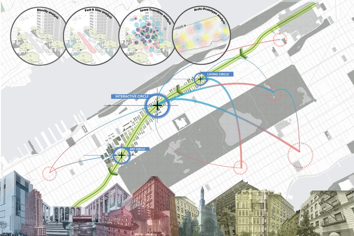 Manhattan is a fast-paced city. People here are all chasing progress and moving faster and faster. As a result, the streets become sterile but efficient. This project designs a prototype for the street that could slow people down by generating different street-based programs that satisfy unique interests. By utilizing the green-belt space in the city, this prototype could generate public social space with different programs and finally could bring slow options for the people in the fast city.