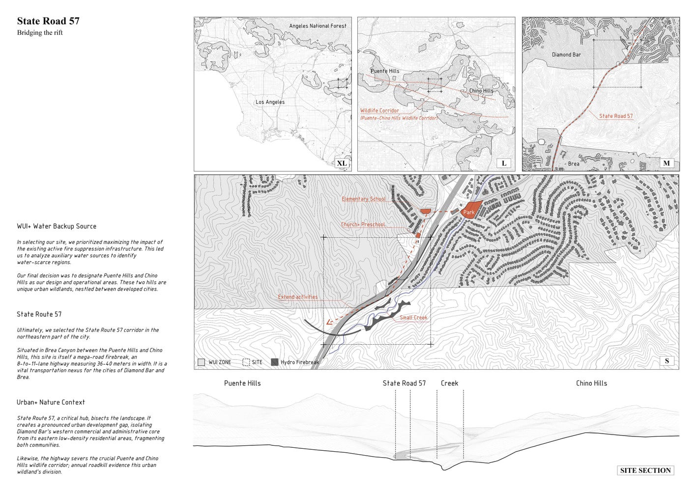 The Hydro Firebreak Commons reimagines Southern California’s wildfire-prone Sate Route-57 (SR-57) corridor as multifunctional infrastructure that bridges ecological resilience and community engagement. Responding to the highway’s divisive condition, the project proposes a linear system of modular water-based firebreaks that integrate fire mitigation with public amenities and a thoroughfare for flora and fauna. Through rainwater collection, cooling mist nozzles, and embedded emergency services, the design actively moderates fire risk while transforming neglected spaces into communal assets. During non-fire seasons, the site offers recreational and educational functions; during emergencies, it becomes a responsive buffer zone. The project balances systemic analysis and spatial imagination to propose infrastructure as a shared, regenerative commons.