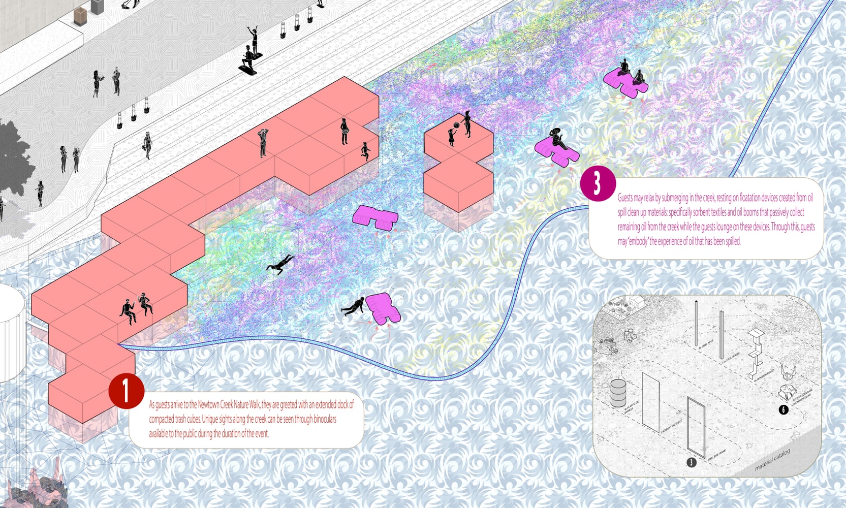 TOUCH: Guests may submerge themselves into the polluted creek water by relaxing on floats made from oil sorbent materials with a perimeter containment boom where guests can “embody” the experience of petroleum in an oil spill.