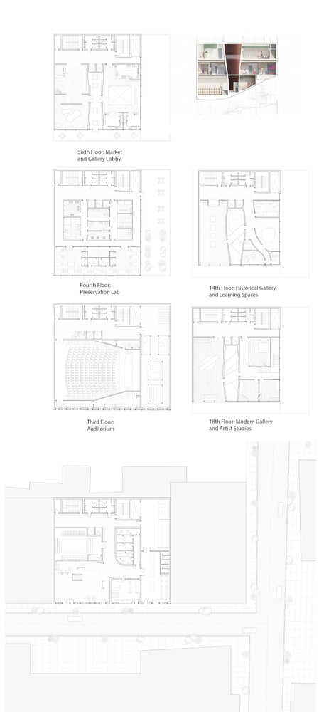 This project proposes a contemporary Arab American museum conceived as an architecture of movement, exchange, and cultural continuity. Drawing from the history of Arab American peddlers—whose livelihoods depended on mobility, trade, and connection—the museum translates these networks into a spatial experience. The building is organized into three interrelated components: exhibition, archive, and cultural production. Rather than functioning as isolated programs, these elements intertwine through shifting forms, shared voids, and transitional spaces that emphasize exchange between past and present.