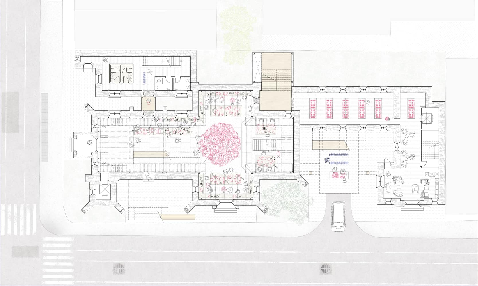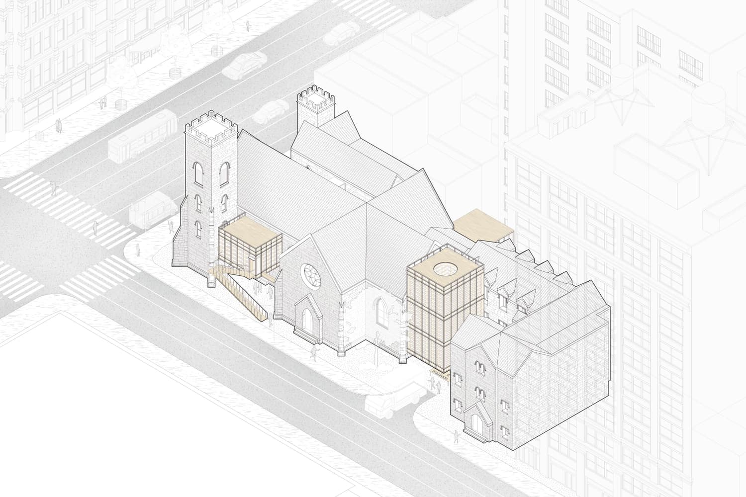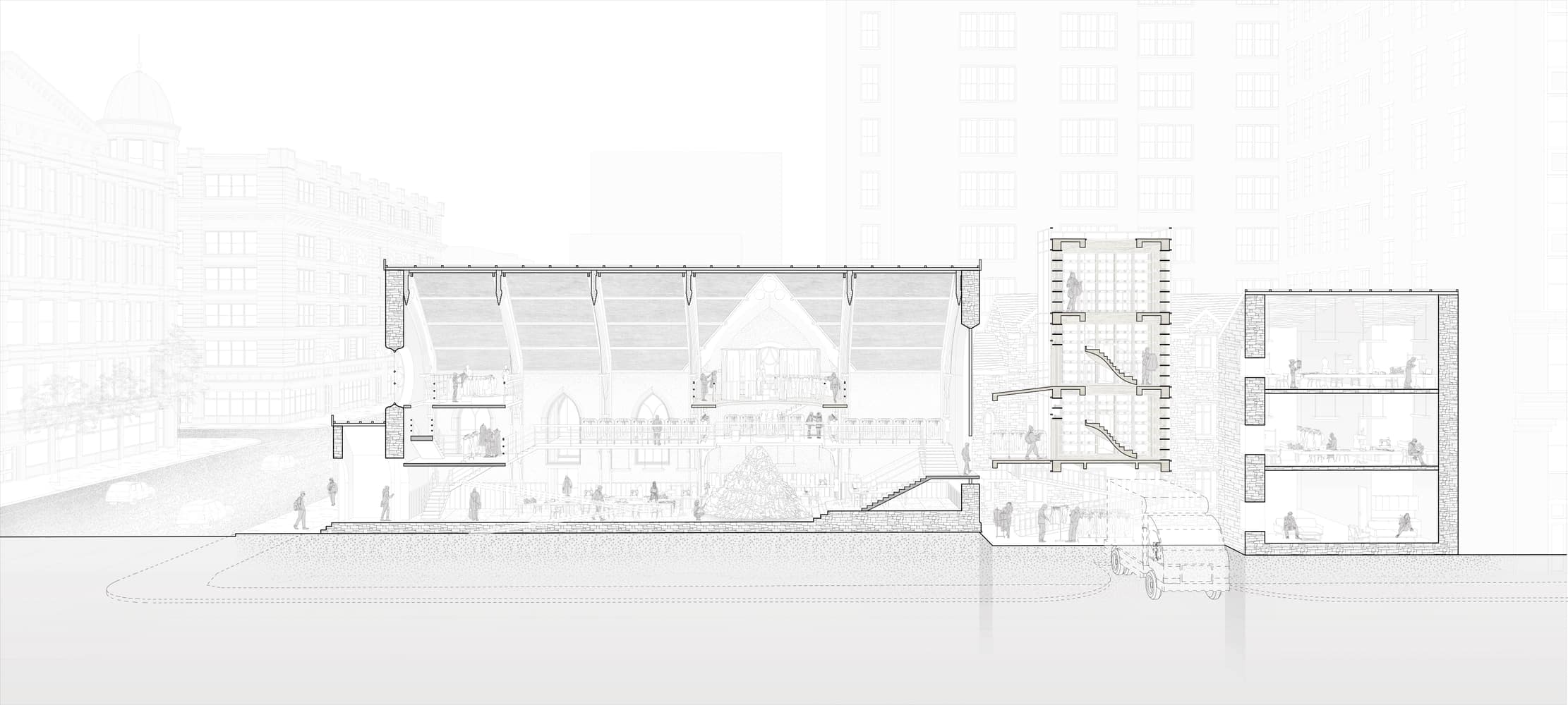 The project establishes a permanent charitable institution supported by student-led production, limited retail, and partnerships with nearby churches and educational institutions. Through the repeated cycle of taking, transforming, and redistributing clothing, the church is reactivated as an infrastructure of care, dignity, and urban refuge.