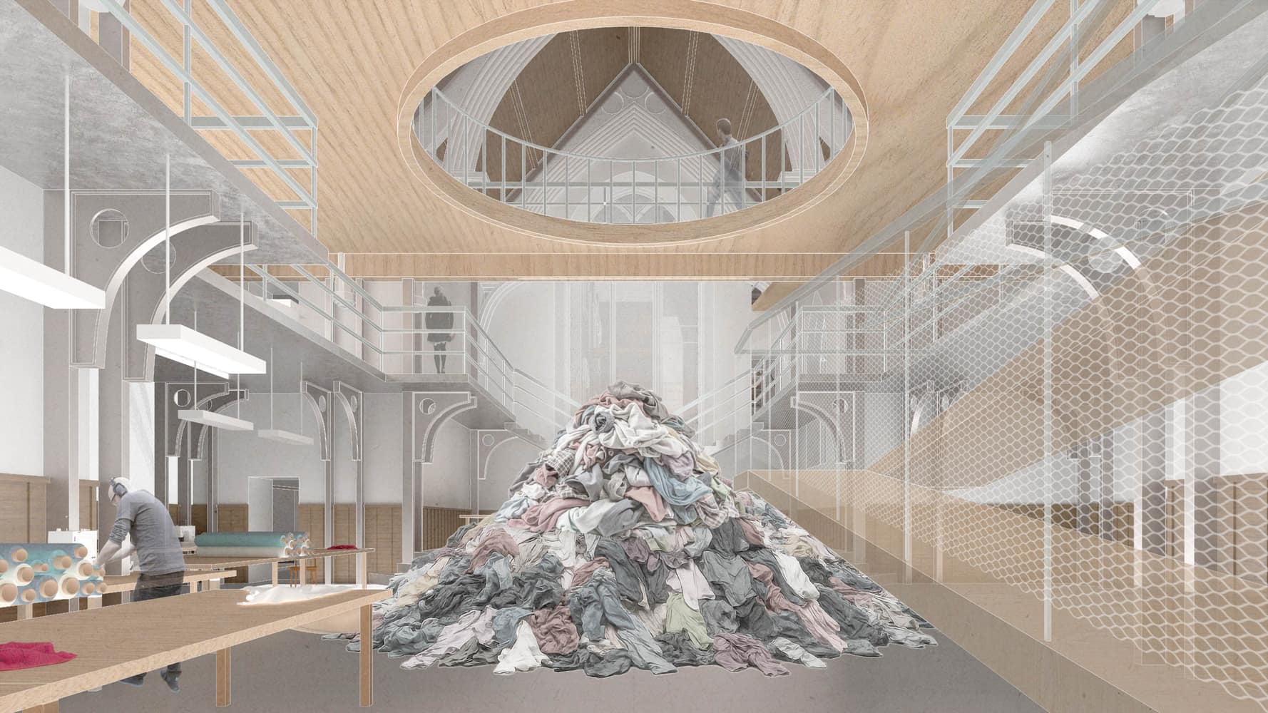 Drawing from the church’s cruciform and liturgical spatial structure, the project introduces a new everyday ritual centered on clothing. At the crossing of the church, directly in front of the original altar, a “sacred cloth mound” is created where second-hand garments are deposited. Nearby fashion students transform these clothes, which are then freely redistributed to people in need, including the surrounding unhoused population.