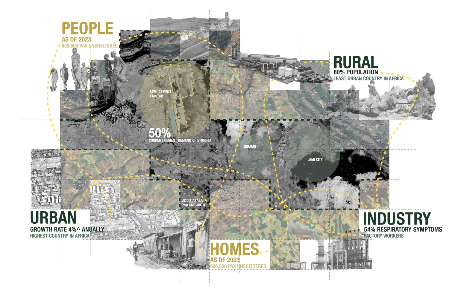 Many projects are framed around a distant end goal; our proposal instead foregrounds what can be enacted in the present, drawing on existing resources and local skills. It envisions a link between the permanent and the adaptable. Sited beside a major cement factory, it proposes multifamily housing for laborers with the intention that this model can eventually extend to the broader community and push the design to mediate between urban density and rural edges. Using carbon-captured concrete and untreated–unsorted bamboo, the project forms a permanent carbon center around which modular units plug in and out over time. Each module is designed to incentivize community participation in its cyclical structural bamboo replacement, keeping the system regenerative and positioning relationships and carbon at the core.