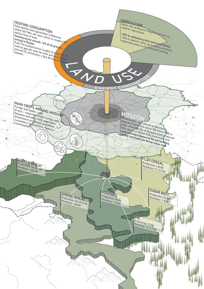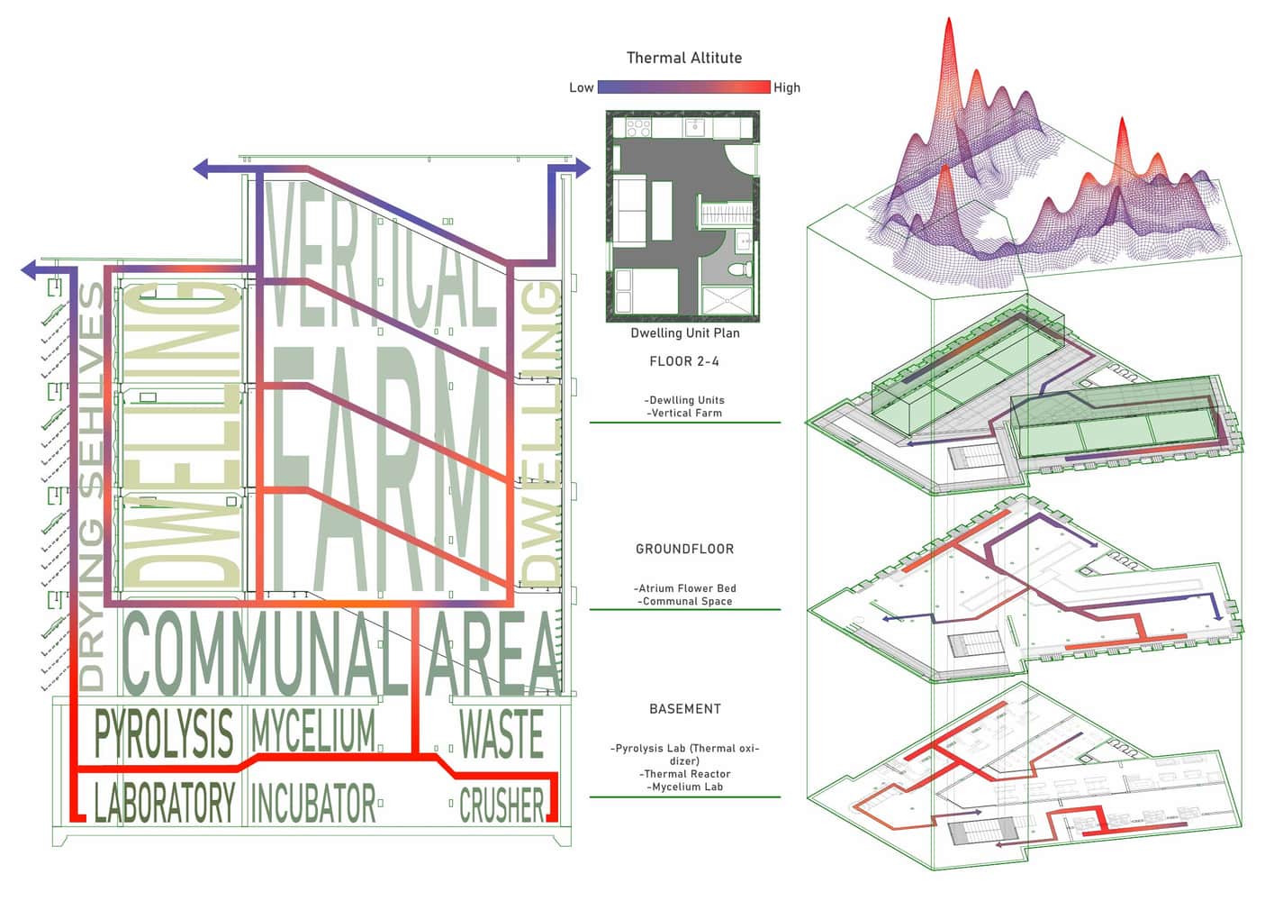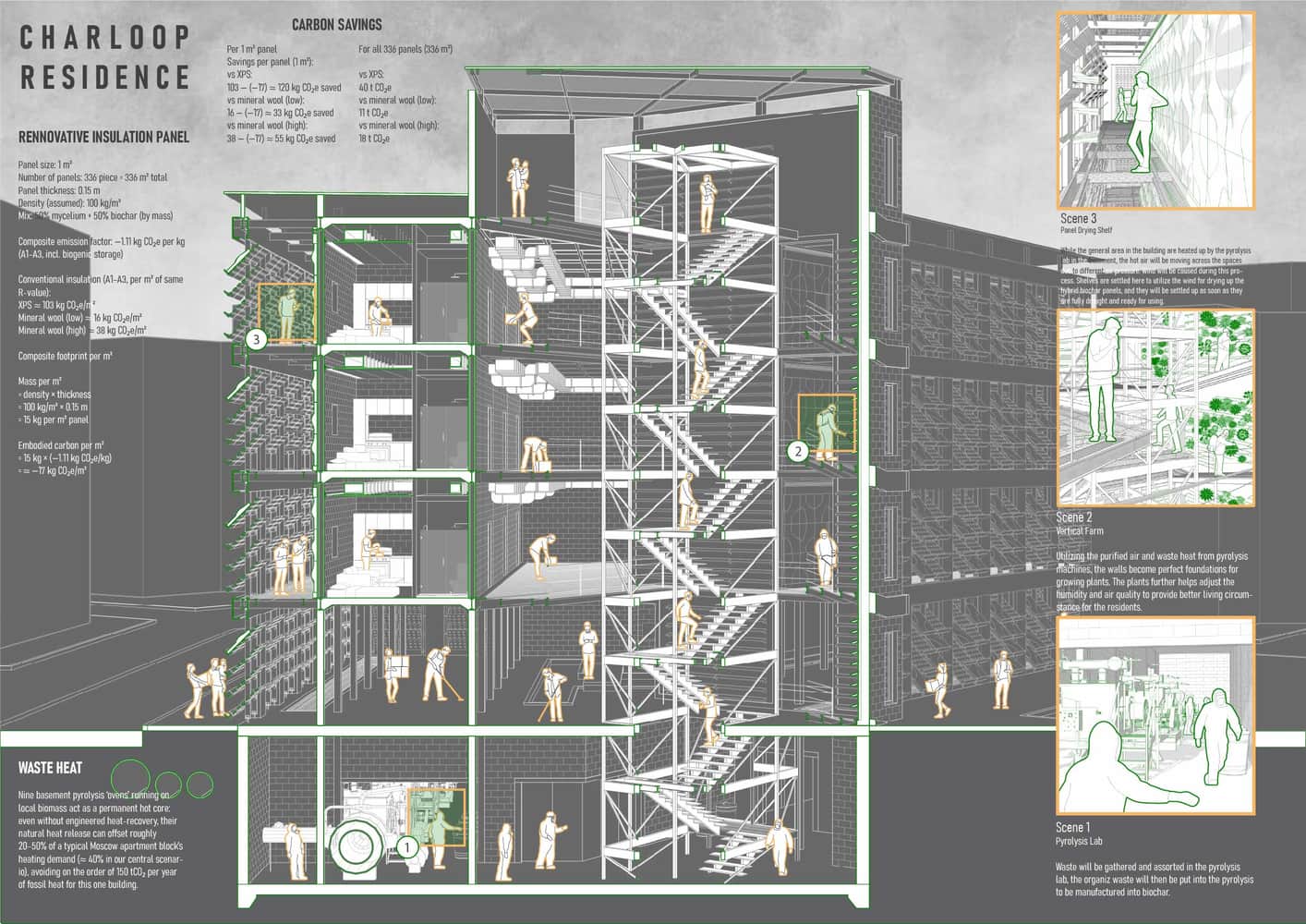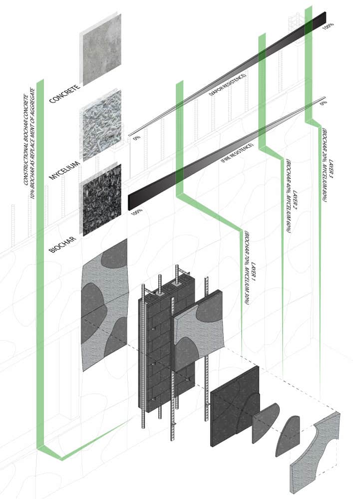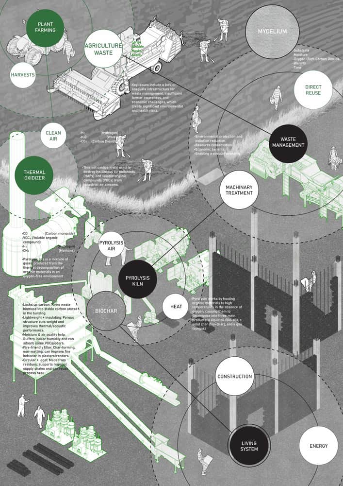 This residential project imagines the apartment building as a living carbon loop. A biochar pyrolysis core in the basement receives residents’ everyday organic waste, transforming it into stable carbon while releasing low-grade heat that is redirected to warm interiors. Above, mycelium-biochar composite panels form a thick insulating skin, further reducing operational energy and locking away carbon in the envelope itself. Structure, services, and daily habits are woven into one metabolism, where comfort is powered by what the building and its occupants continually digest. The result is a carbon-negative habitat that turns household residue into climate repair.