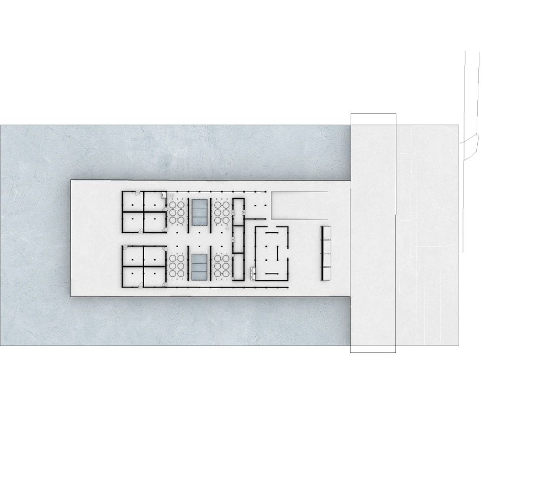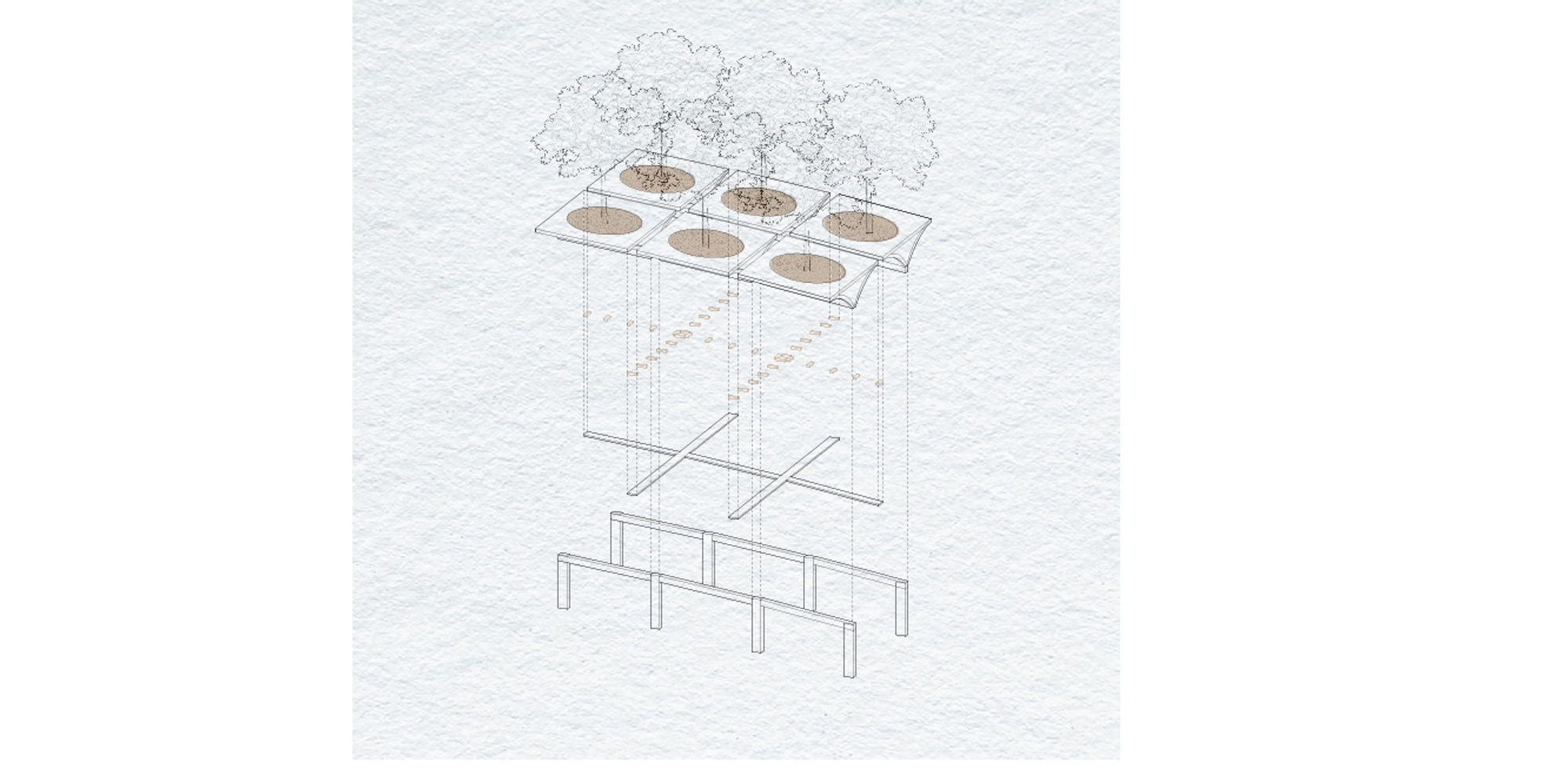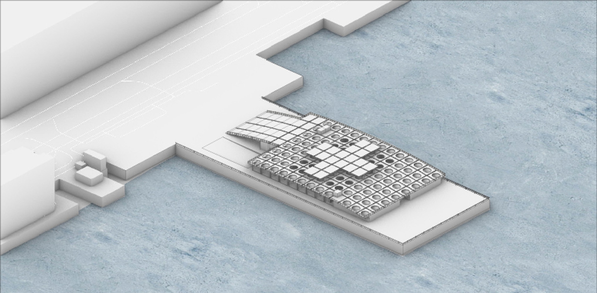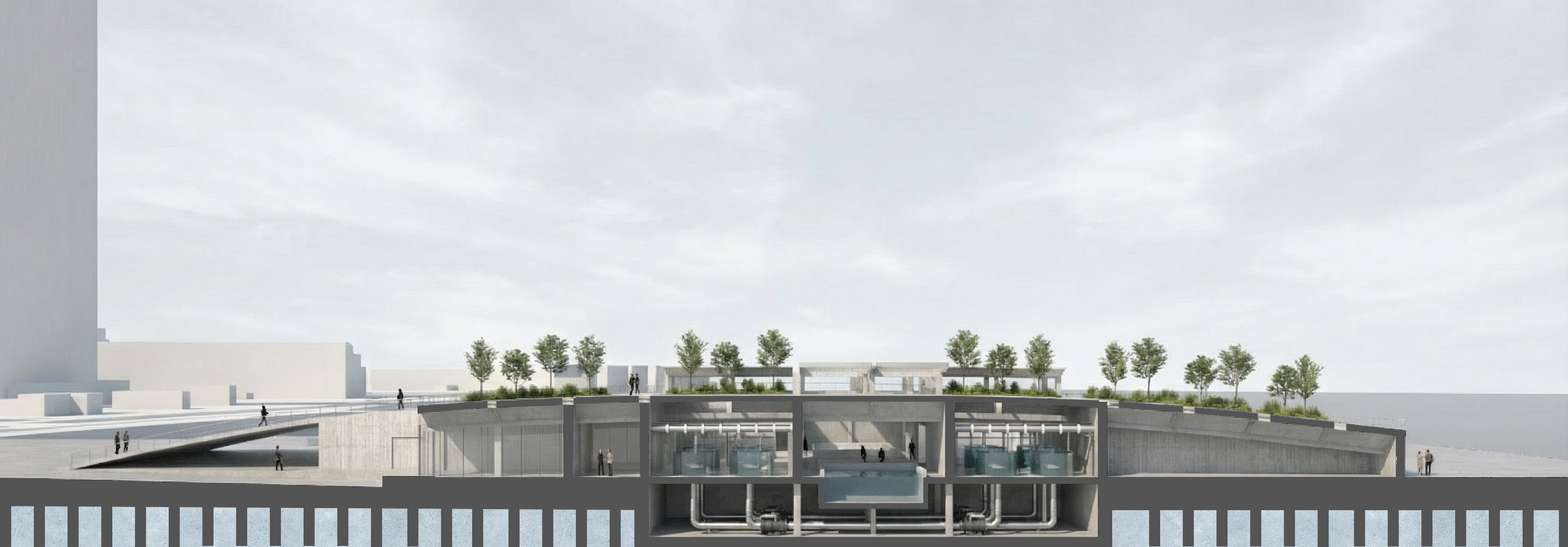 This Pier 76 fsh-farming complex blends public space with aquatic production. A sloping rooftop landscape creates an open park where visitors walk among tree-lined islands overlooking the Hudson River. Beneath, vaulted spaces house a fsh factory connected directly to the river for fltration and breeding. The design merges ecology, industry, and recreation into one urban waterfront infrastructure.