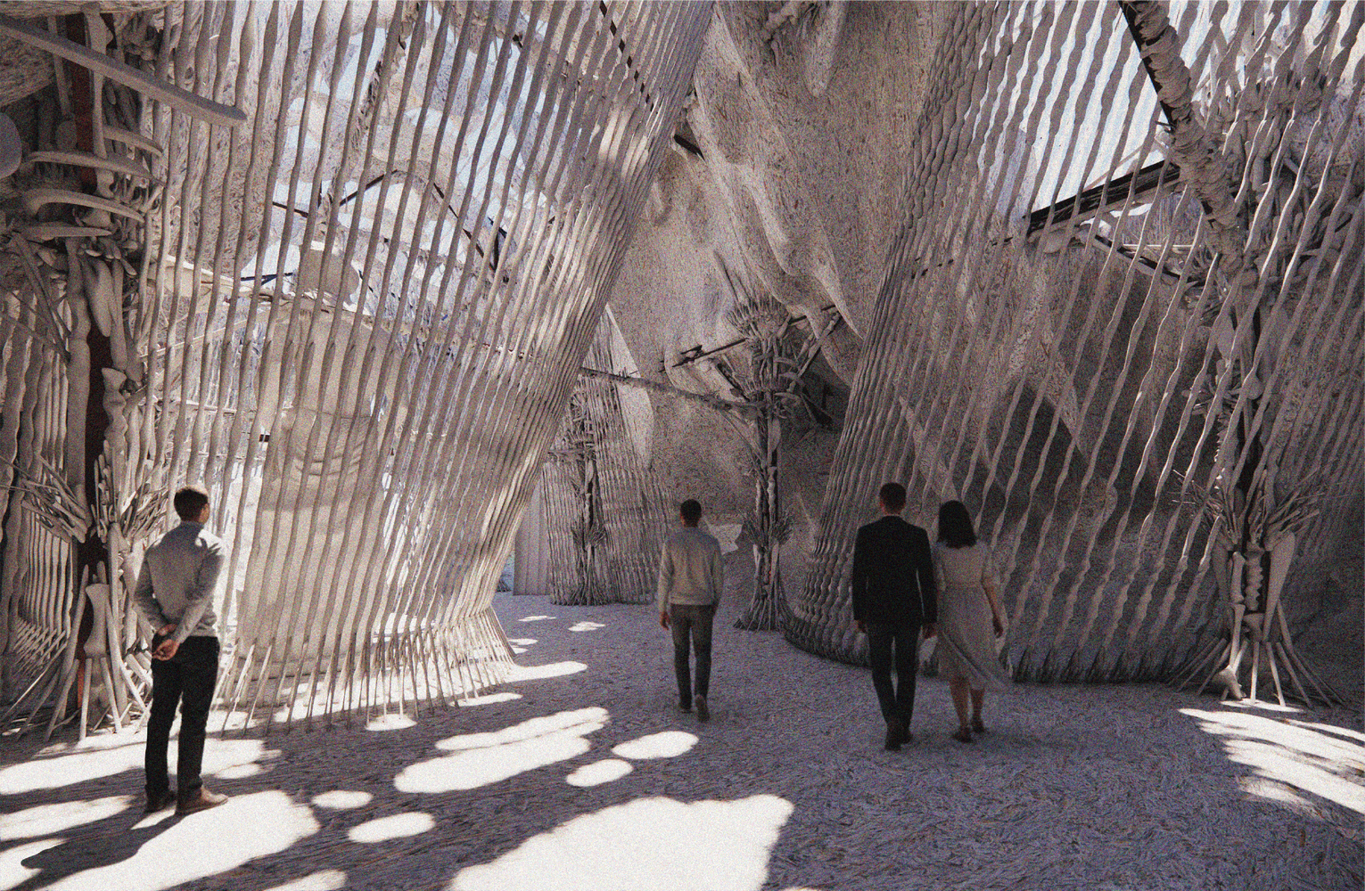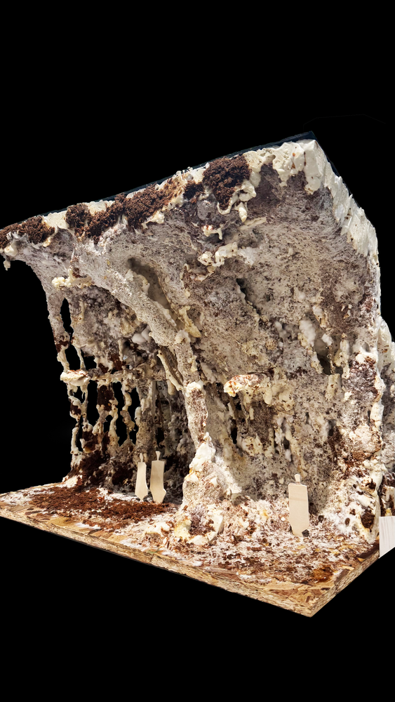 Mycoentropy is a temporary artistic space proposed for the T9 Warehouse site in Fort Tilden, New York. The project challenges architecture’s reliance on permanence by exploring impermanence as a structural and ecological strategy. Mycoentropy frames growth, transformation, and decomposition as integral phases of architectural life. The design reinterprets the warehouse by retaining its steel frame and extending it with a wooden structure. A tensile network of steel cables wrapped in rope made from local plants (straw and cattail) establishes a new structural system. As mycelium colonizes this rope substrate, it reinforces the cable assemblies, transforming them into living columns. They expand and adapt to spatial needs, carving out niches, paths, and cavities that define areas for exhibition, performance, and gathering. The interior is shaped through a molding and excavation process that allows mycelium growth to determine spatial geometry. Over time, the same organism that generates structure initiates its breakdown, aligning the building’s lifespan with ecological cycles.