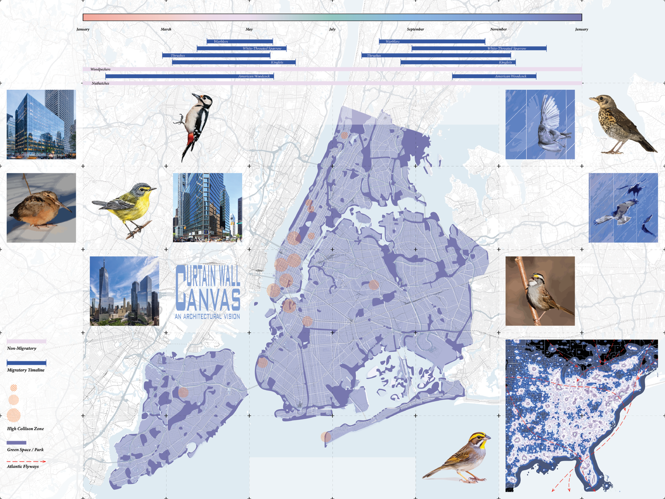 This architectural intervention confronts the growing challenge of bird-window collisions along major urban flyways, utilizing the 165-foot-tall cable net facade at 10 Columbus Circle as its site. We envision a responsive curtain wall that replaces static glass with dynamic, adjustable layers of fabric.