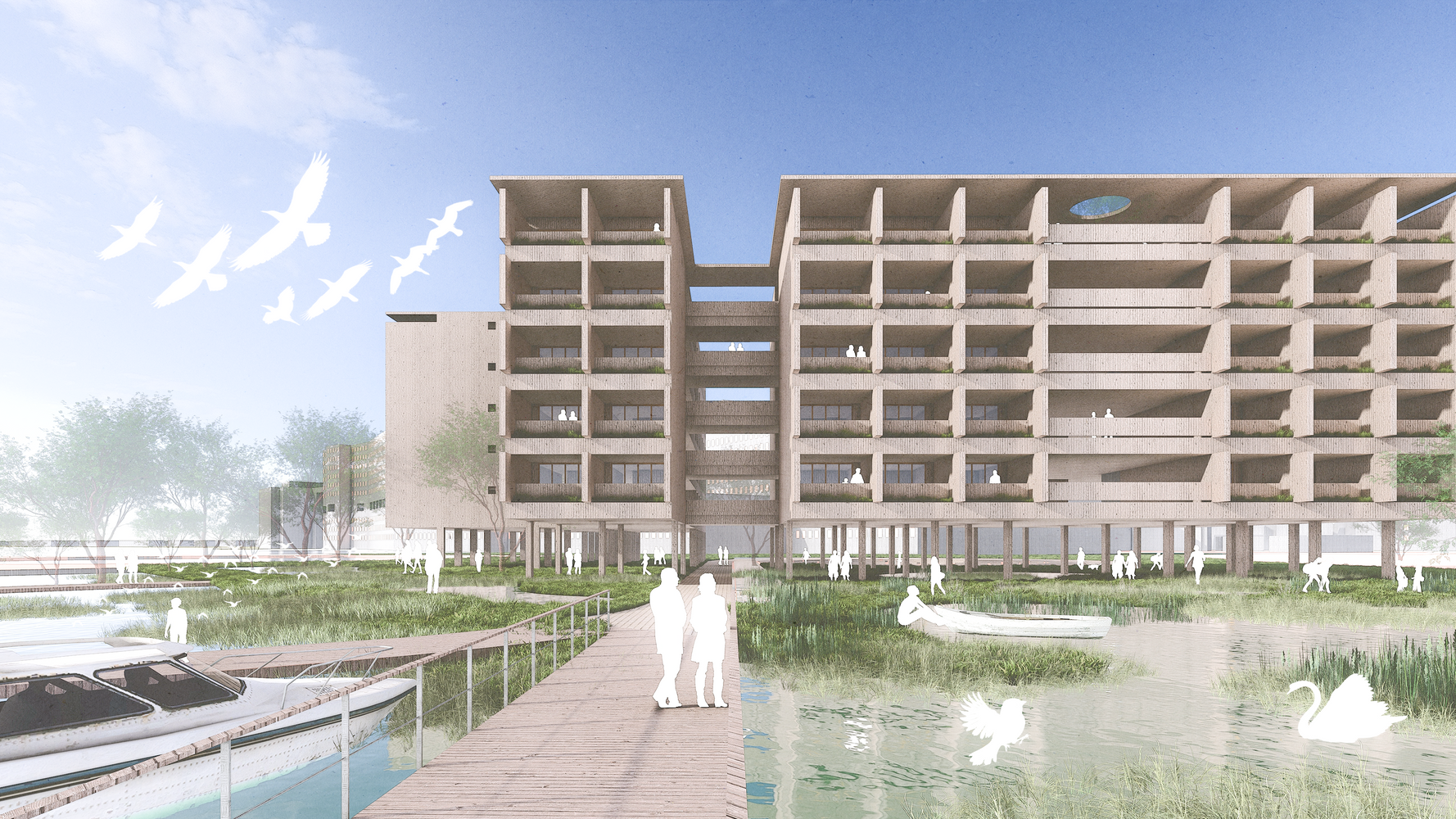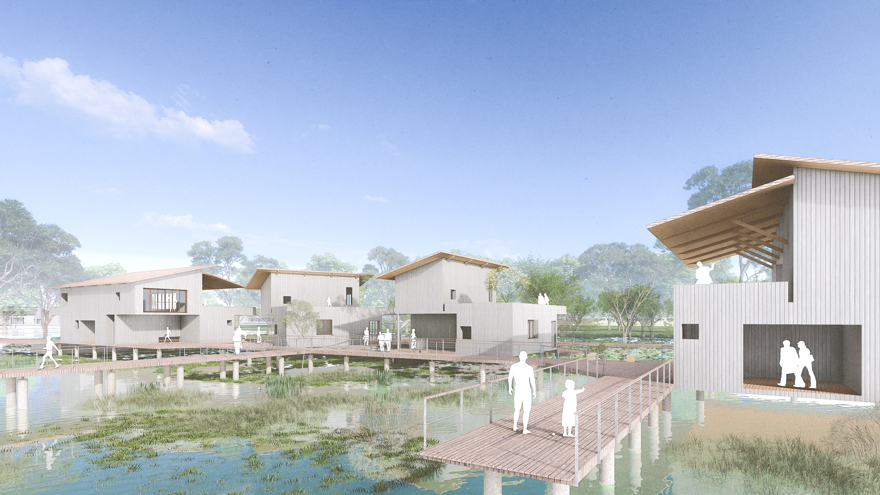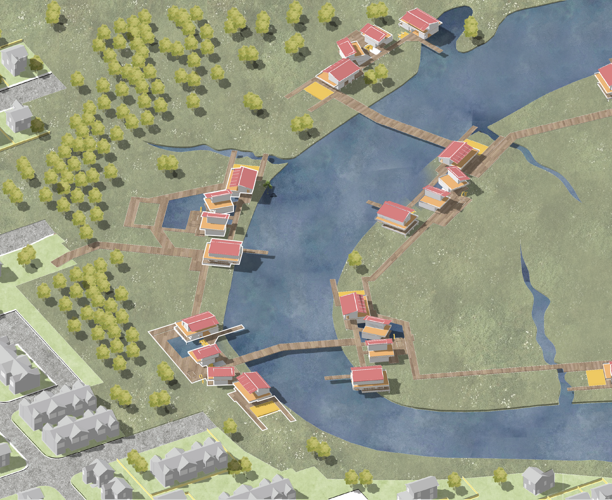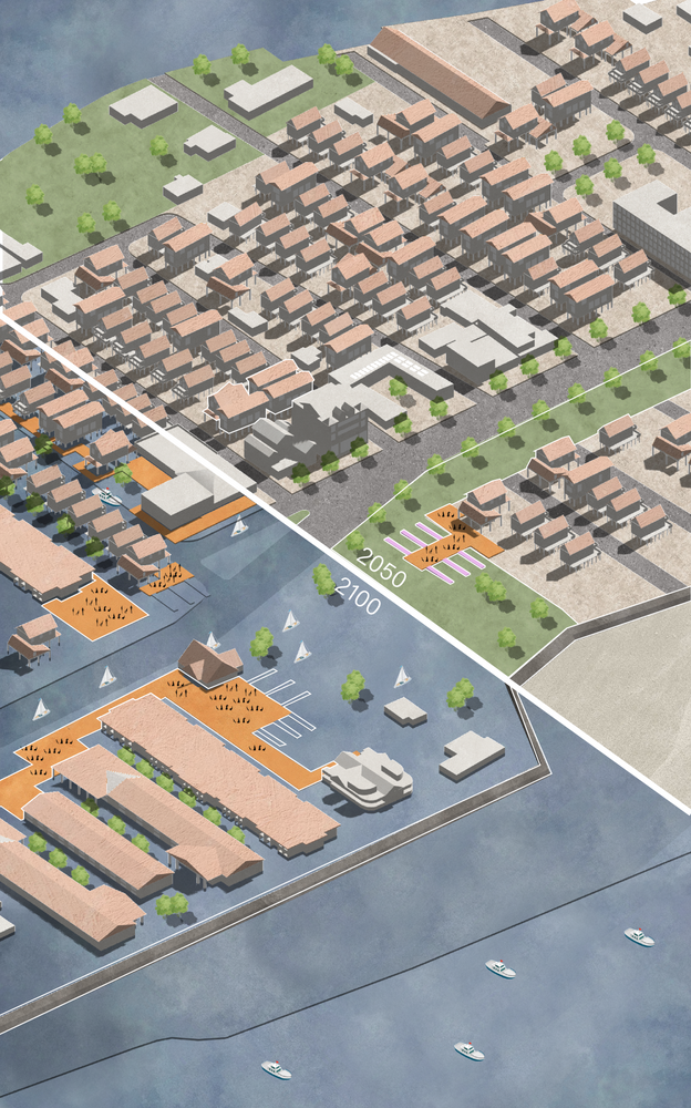 Our regional strategy addresses these conditions through coordinated renovation and retreat in Sea Bright, the transformation of existing parks and parking lots into resilient landscapes across Rumson, Fair Haven, and Red Bank, and the introduction of new housing along the Red Bank waterfront and upper Swimming River to support rainwater collection and algae-bloom remediation. By linking these interventions, a continuous Green Trail is formed, restoring public access, strengthening ecological performance, and redefining the relationship between people and water.