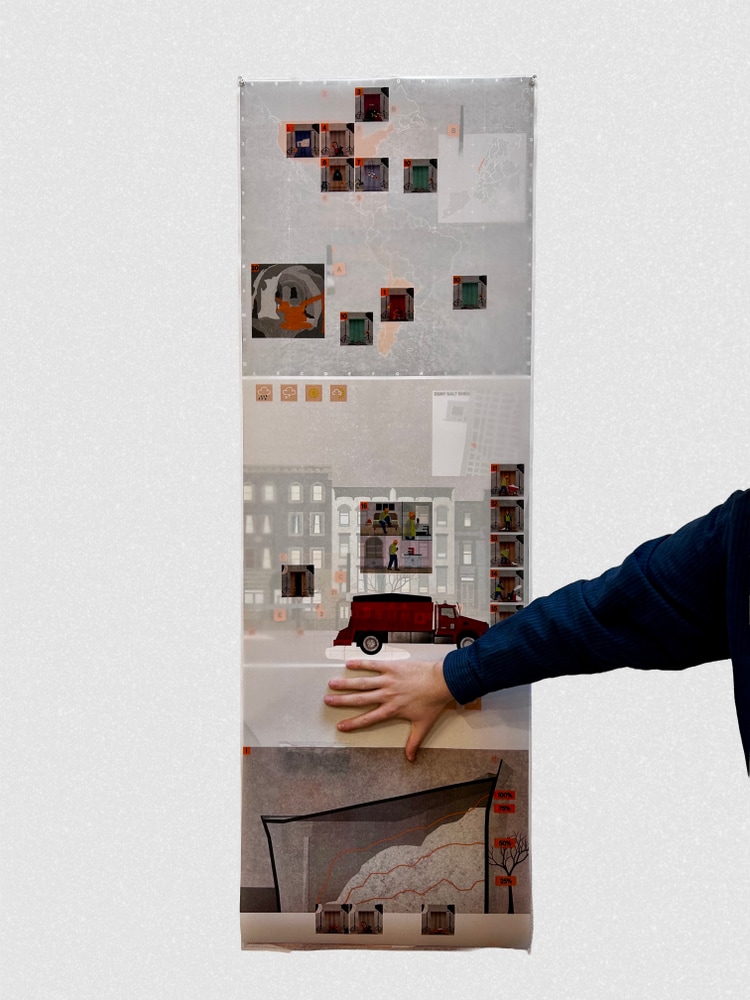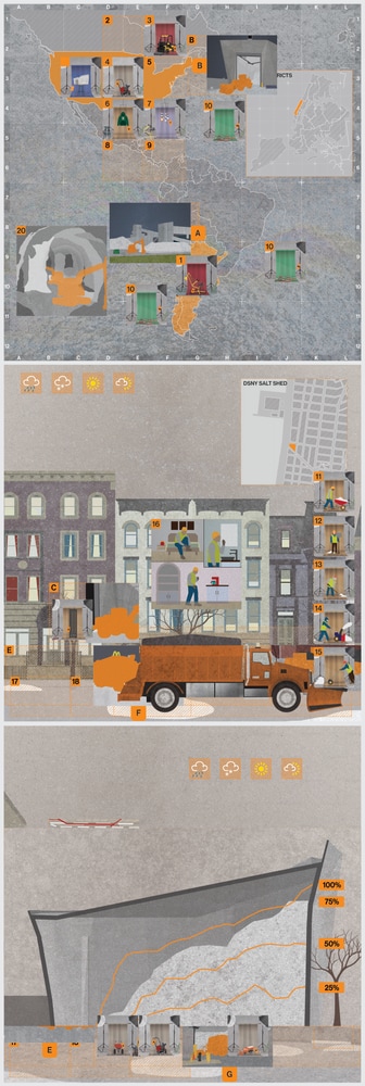 This project approaches the Spring Street Salt Shed as an infrastructural actor embedded within a wider network of material, climatic, and logistical relations. Drawing on Bruno Latour and Actor–Network Theory, the work reframes architecture as a mediator that coordinates planetary extraction, seasonal weather, municipal labor, and urban maintenance. Salt operates as a more-than-human agent whose presence intensifies and recedes throughout the year, reorganizing streets, machines, surfaces, and bodies. A series of layered drawings and renderings make visible how these actors appear, disappear, and reconfigure over time, foregrounding overlooked actors. The project began with an index of rubbings and photographs that register wear, residue, and neglect, attending to how infrastructures of care are themselves uncared for. Rather than treating representation as neutral documentation, the work uses drawing as a mediating device that assembles heterogeneous, trans-scalar actors onto a shared surface, revealing the distributed agencies that sustain - and corrode - New York City.