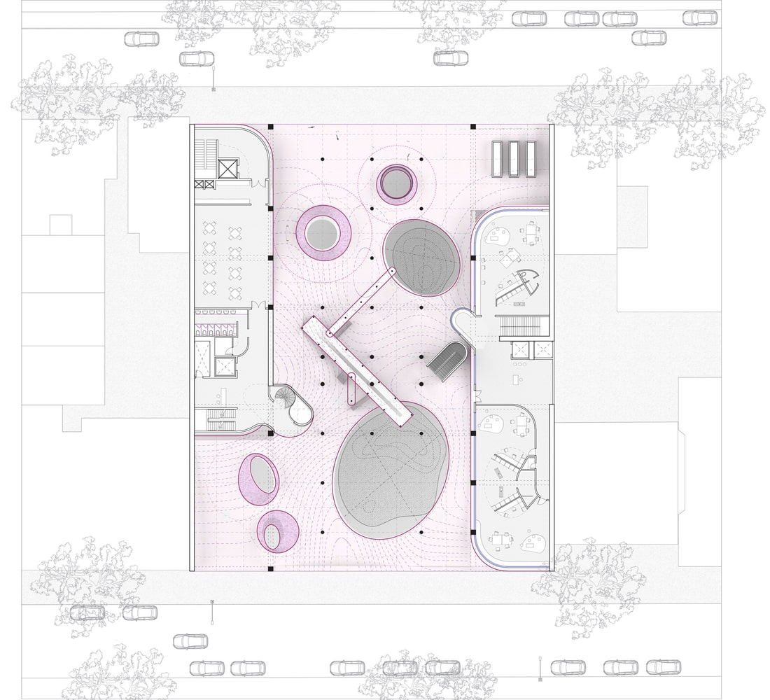 Referencing Hertzberger’s ideas of an educational promenade, this project challenges the notion of the physical dissociation between the school and the neighbourhood by demonstrating the potential to integrate community activity into the framework of an educational institution. Through an assembly of curvature, rigidity, transparency, and solidity, a fluid datum of play serves as a physical medium that facilitates the democratization of today’s sequestered schoolyard.