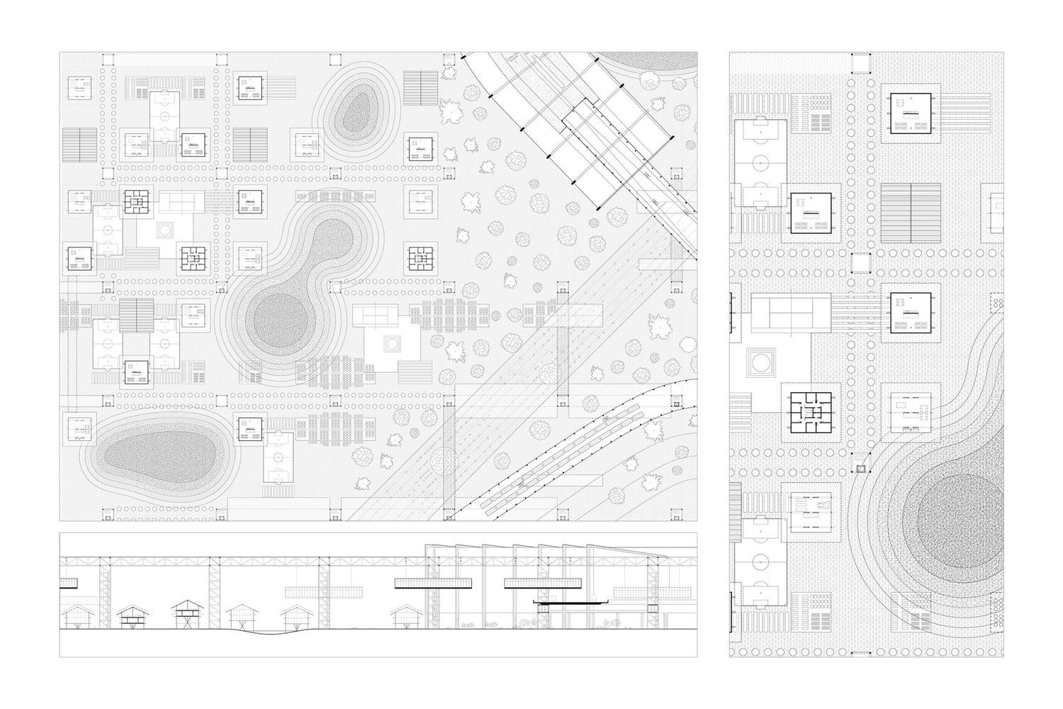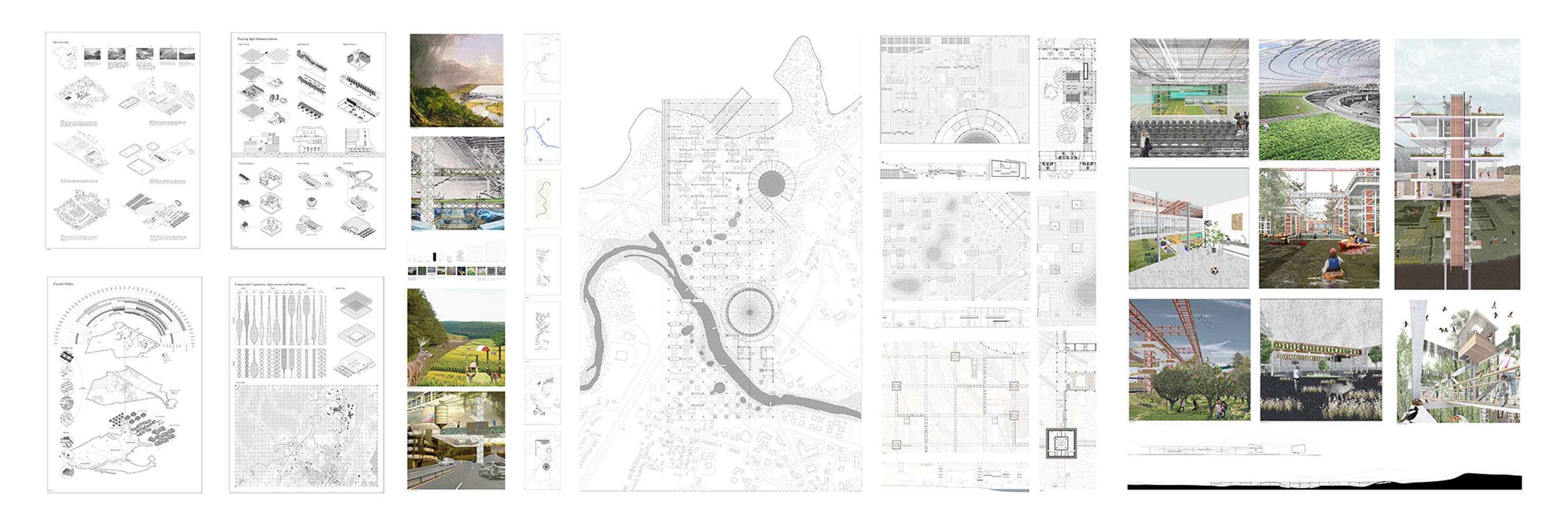 Critiquing the redundancy and disconnect between three parallel infrastructures —agritourism, logistics, and migrant labor— of agriculture, a new experimental campus serves as an independent prototypical zone that designs for moments of intersection through overlapping layers of an ecological corridor, agriculture, housing, and infrastructure within the urban context.