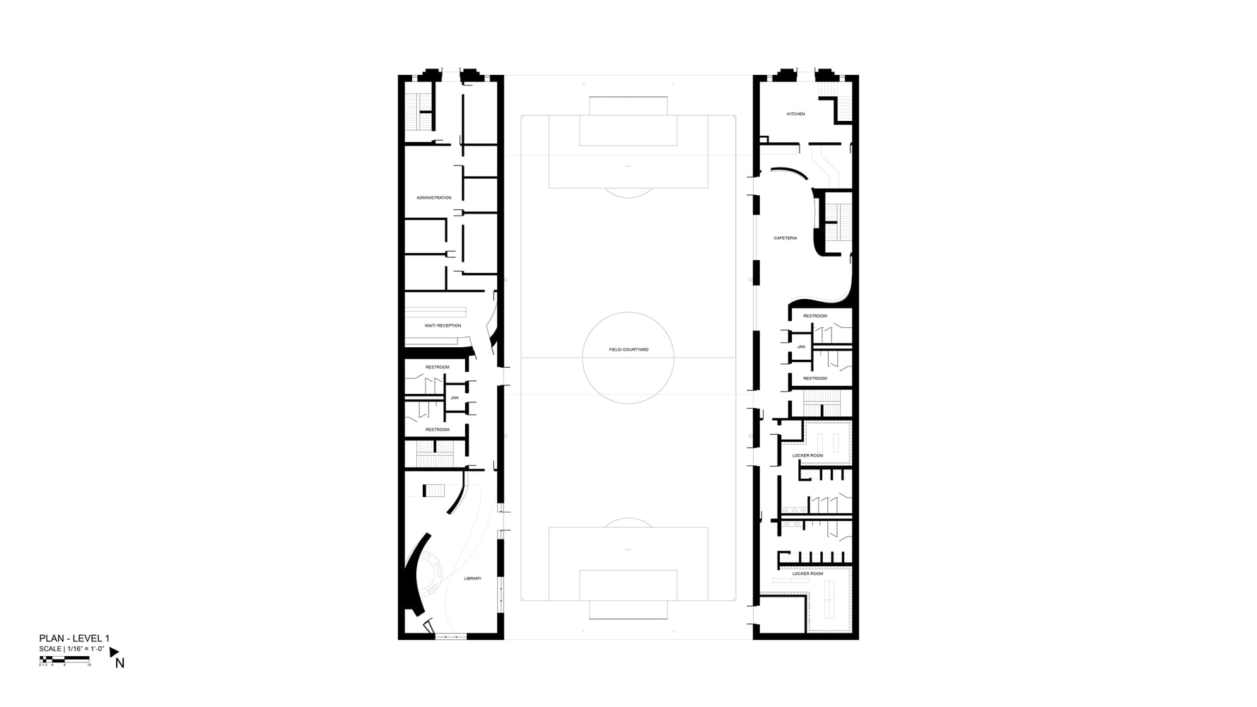 The Learning Field seeks to create fluidity between the different learning spaces to allow for a back-and-forth passing of knowledge among different classes. An analysis of the impact point of a soccer ball and the effect it has on the arc of a ball’s path informed the carving of the arched and lofted learning spaces. These spaces are visually connected—horizontally across the two end bars of the building, and onto the central, multifunctional soccer field, and vertically within the end bars—to inspire students to learn and experiment through observing the movements and actions occurring around them.
