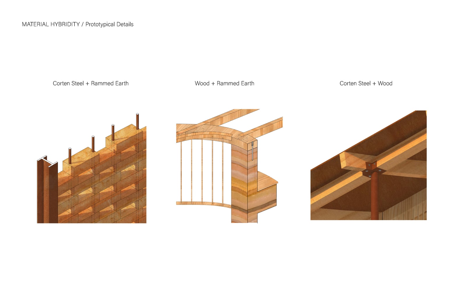 The Continuum of Farming, Stewardship, and Spirituality is a sequence of multi-purpose spaces that exist along a 1.5-mile circular path connecting four farms, a monastery, and a community center in the Hudson Valley of New York. Acknowledging the breadth of programs that exist on-site, the project seeks to provide a platform on which the three programs of farming, stewardship, and spirituality can hybridize to bring about a spatial and institutional model that introduces new modes of practice between existing stakeholders. The programmatic hybridity is translated through a combined architectural language of wood, corten steel, and rammed earth along the sequence of spaces.